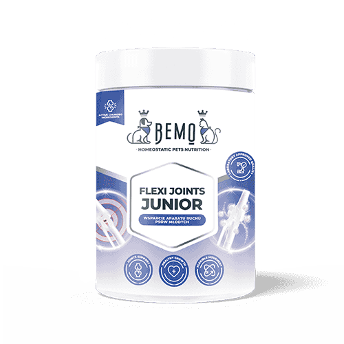 A fiatal kutyáknak az intenzív növekedés során kiváló támogatásra van szükségük a csontváz és a csontváz kialakulásához. A Bemo Flexi Joints Junior tökéletes természetes kiegészítőként szolgál a nagytestű kölyökkutyák és minden fajtájú fiatal kutya támogatására életük legfontosabb időszakában. A II. típusú hidrolizált kollagén az ízületi porc fő alkotóeleme. Hidrolizált formában (azaz kisebb molekulákra osztva) könnyebben felszívódik a szervezetben. Gyulladáscsökkentő tulajdonságokkal rendelkezik, támogatja az ízületek regenerálódását. Ezenkívül a II-es típusú kollagén hozzájárul a porcmátrix helyreállításához, ami kulcsfontosságú a sportkutyák és munkakutyák ízületeinek további károsodásának megelőzésében. Ezenkívül természetes módja az osteoarthritissel kapcsolatos tünetek csökkentésének. Sérülések vagy ízületi műtétek után sikeresen segíti az állat teljes, egészséges és gyors felépülését. A Flexi Joints Junior formula másik hatóanyaga a csipkebogyóban található galaktolipid, amely segíthet csökkenteni az ízületi gyulladást. A GOPO segít csökkenteni az osteoarthritis fájdalmát, és javítja a mozgásszervi rendszer rugalmasságát és általános működését. Glikozaminoglikánok (GAG), például hialuronsav, amelyek segítenek hidratálni és védeni az ízületi felületeket. Elasztin és bioaktív fehérjék az ízületek rugalmasságának támogatásában játszanak fontos szerepet. Lizoenzimként, azaz gyulladáscsökkentő és antibakteriális tulajdonságokkal rendelkező enzimként van jelen a szervezetben. A terméket napi megelőző alkalmazásra ajánlják 9 hónapos és 24 hónapos kor közötti fiatal kutyáknál. Különösen ajánlott ízületi megerőltetésnek kitett fajtájú kutyák és mozgásszervi problémákra hajlamos fajták számára (nagytestű és óriás fajták, mint például: újfoundlandi, német dog, labrador retriever, tibeti masztiff stb.)