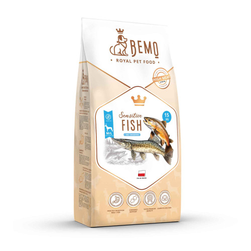 Gabonamentes, teljes értékű, szuperprémium szárazeledel felnőtt kutyák számára. Tökéletesen kiegyensúlyozott étrendet biztosít, optimális mennyiségű és könnyen emészthető, kiváló minőségű fehérjével. Hipoallergén formula minden fajtájú felnőtt kutyának. Különösen ajánlott érzékeny emésztőrendszerű, ételallergiára és ételintoleranciára hajlamos, valamint válogatós kutyáknak. A Bemo Sensitive Fish egy hipoallergén formula alapján készült, amely csak egyféle húst tartalmaz, azonban három féle halból tevődik össze. Hipoallergén és kiemelkedően ízletes pisztráng-, csuka- és süllőhúsból áll. A pisztrángot halvány rózsaszín, finom és sovány hús jellemzi. Az édesvízi halak közül a legértékesebb omega-3 és omega-6 savakat biztosítja. A csuka az egyik legfinomabb édesvízi hal. Ez a belvizekben élő ragadozó kivételesen ízletes hússal rendelkezik. A süllő gazdag fehérje-, valamint A- és E-vitamin-forrás. A süllőnek más táplálkozási tulajdonságai is vannak, amelyek miatt széles körben értékelik az egészséges táplálkozás támogatói körében. Nagy mennyiségben tartalmaz olyan értékes ásványi anyagokat, mint a foszfor, a magnézium és a cink. Ezenkívül a süllő gazdag fehérje- és vitaminforrás. Az egészséges hal kiváló alapot jelent az ételintoleranciában szenvedő kutyák megfelelő táplálkozásához. A szuperprémium táp alapjául szolgáló hal mellett megtalálhatóak benne zöldségek, gyümölcsök, valamint olyan egészségjavító táplálékkiegészítők, mint a humin anyagok, tanninok, valamint alpesi üröm. Ezen tápanyagok biztosítják és támogatják a szervezet anyagcsere-egyensúlyát, valamint szabályozzák az emésztési folyamatokat. Az eledelben található kondroprotektív-komplex támogatja a mozgásszervi rendszert, a lazacolaj hozzáadása pedig biztosítja az egészséges bőrt és szőrzetet.